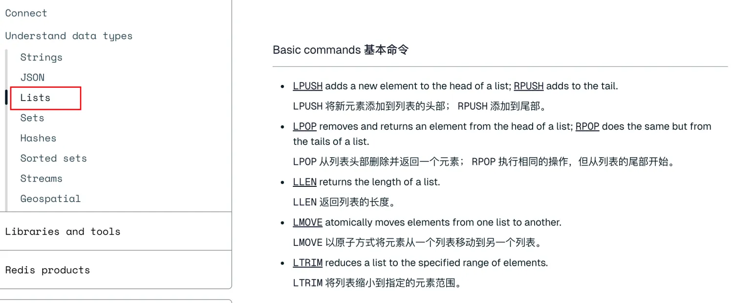 下面我们来看看最常用的数组的基本操作(文档地址:https://redis.io/docs/latest/develop/data-types/lists/),我们在 redis gui 中操作
