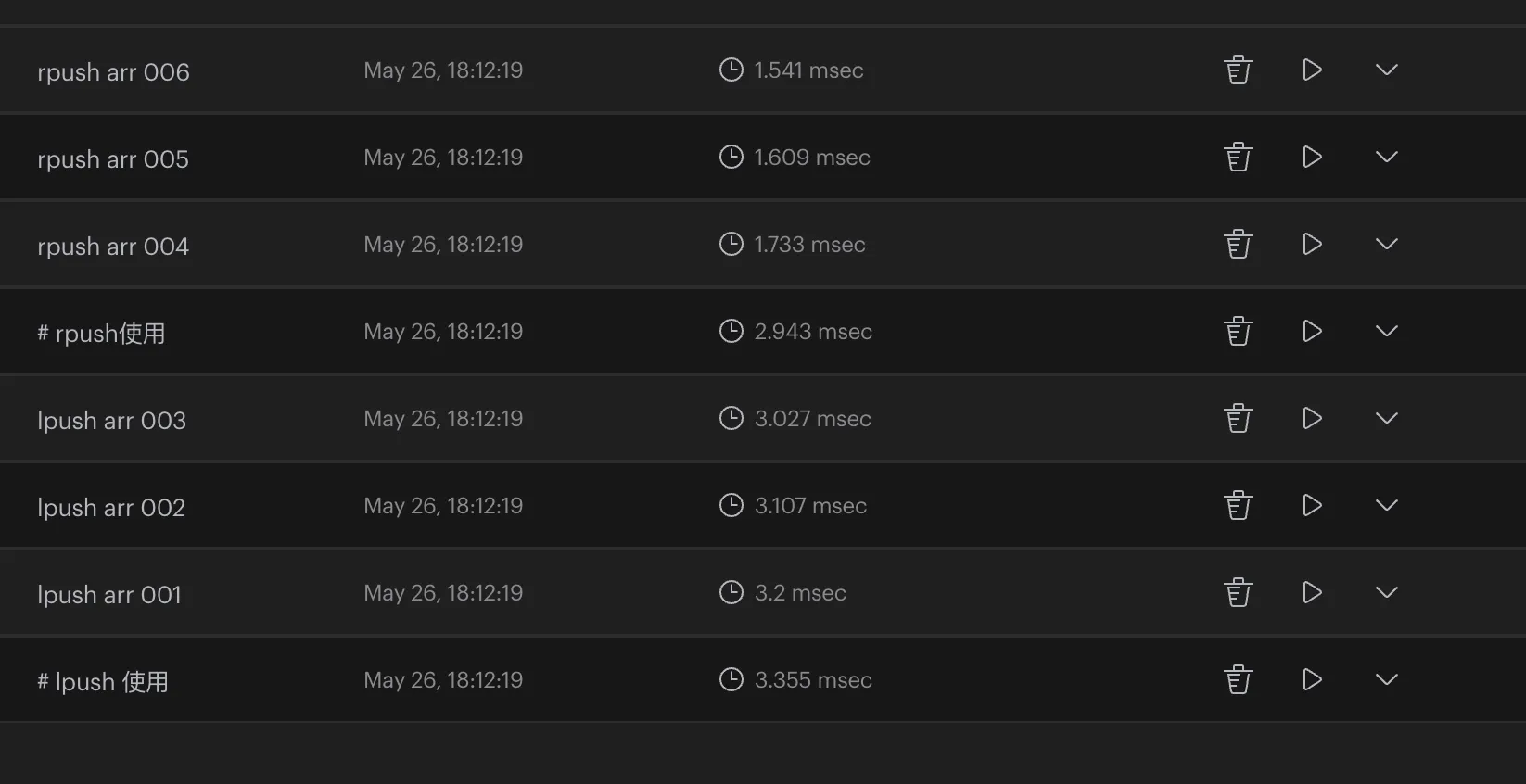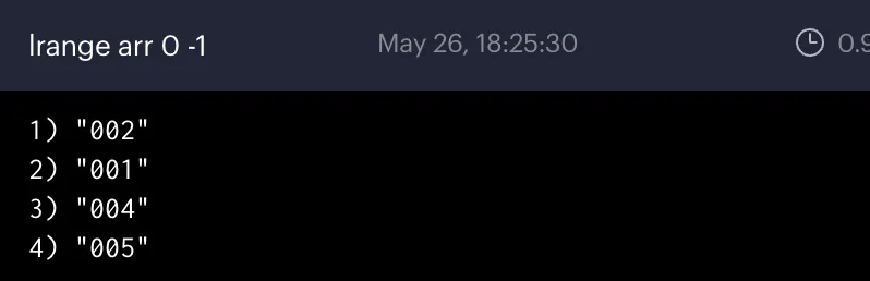 # lpush(left push) 使用lpush arr 001lpush arr 002lpush arr 003# rpush (right push)使用rpush arr 004rpush arr 005rpush arr 006可以看到: